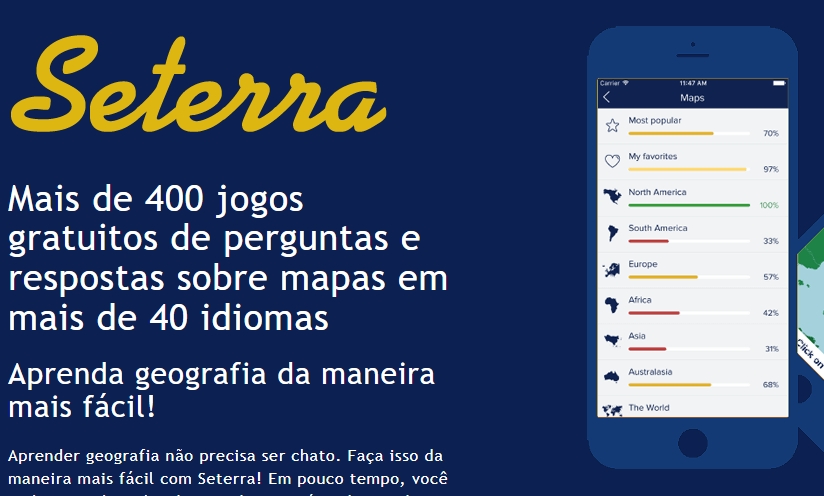 O Seterra é um jogo de perguntas e respostas geográficas disponível online (www.seterra.com) e como aplicativo para iOS e Android. Com mais de 400 exercícios personalizáveis em 40 idiomas, incluindo o Português Brasileiro, ele cobre uma vasta gama de tópicos geográficos. Desde identificar continentes e países até localizar cadeias de montanhas, vulcões, oceanos e as maiores cidades do mundo, o Seterra oferece desafios para todos os níveis de ensino, do fundamental ao médio.
